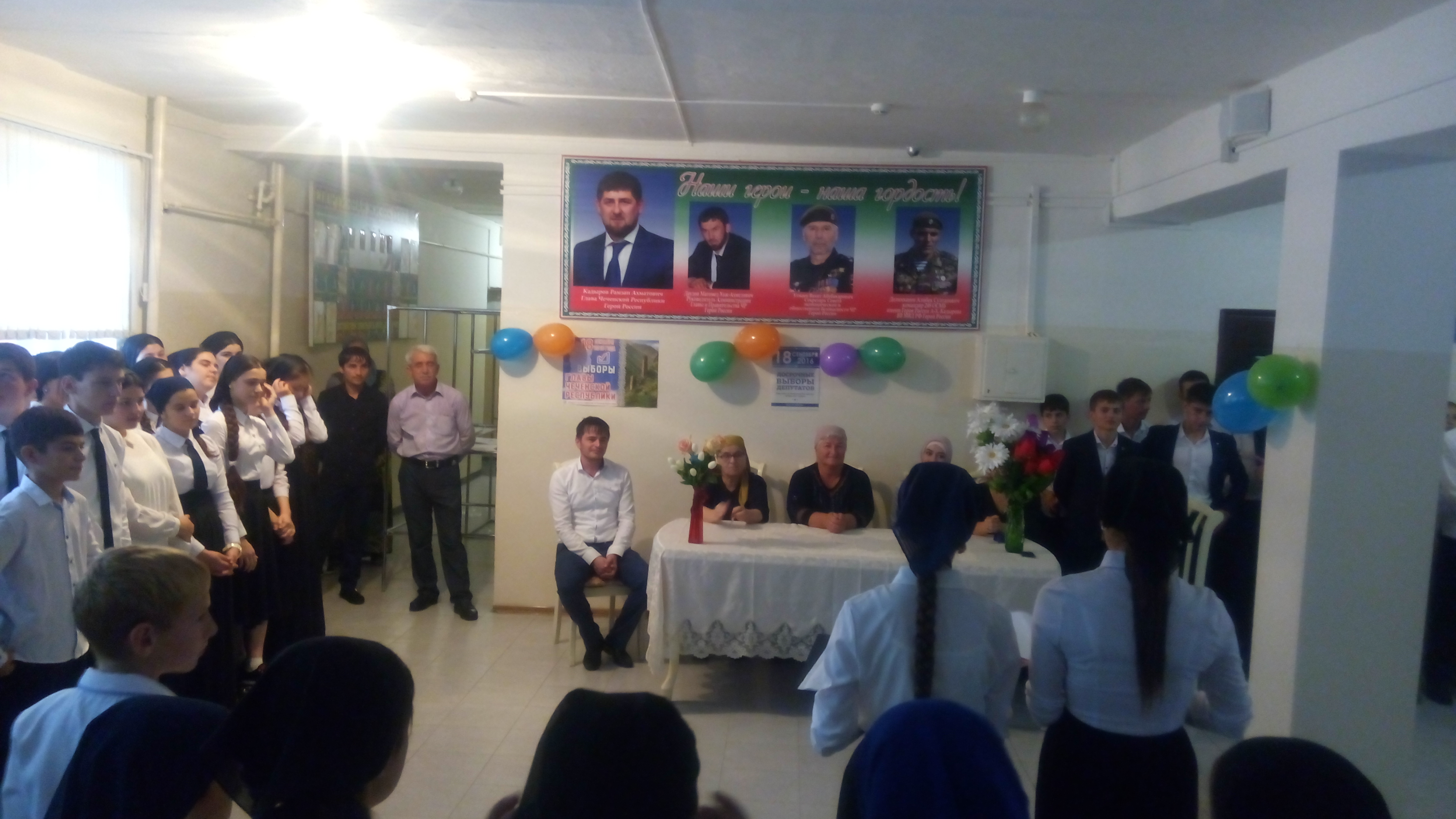 Линейку открыла зам. директора по ВР Каимова А.Р. На торжественной линейке присутствовали гости : главный специалист УО Шалинского района Шамсуева Луиза Зайндиевна и участковый уполномоченный лейтенант полиции Гунаев Махда Абдулгалимович. Они поздравили учеников, их родителей и педагогов с началом учебного года и пожелали успехов в учебе ребятам, а учителям сил и терпения в их нелегком труде. С началом учебного года всех присутствующих поздравила Заслуженный учитель ЧР Абдырашитова М.А.