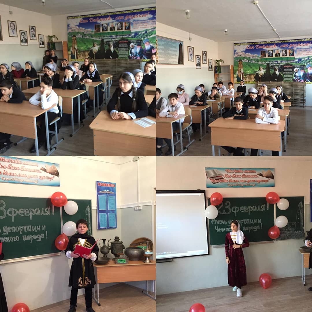 24.02.2021Сегодня 6 «Г» класс провёл мероприятие, приуроченное к 77-летию со дня депортации чеченского народа. В 1944году 23 февраля в шесть утра военные начали стучаться в дома и будить хозяев, давая им два часа на сборы. Затем их везли грузовиками к ближайшим железнодорожным станциям и грузили в "теплушки". Разрешалось брать до 500 кг груза на семью, но фактически большую часть вещей пришлось оставить, поскольку в каждом вагоне должны были поместиться 45 человек со всем имуществом. 23 февраля в районе аула Хайбах пошел сильный снег, заваливший дороги и жители не могли спуститься с гор, чем срывали график депортации. Комиссар госбезопасности 3-го ранга Михаил Гвишиани приказал загнать людей - около 200 человек, по другим свидетельствам— 600–700 человек – в колхозную конюшню и сжечь. Тех, кто пытался вырваться, расстреливали из автоматов. Расстреляли и жителей окрестных хуторов.